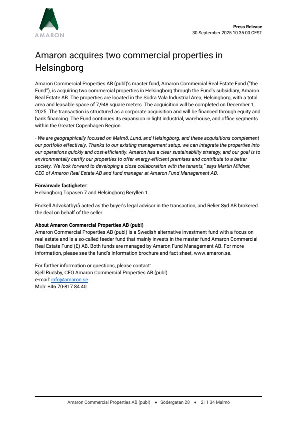 Amaron Commercial Properties AB (publ)’s master fund, Amaron Commercial Real Estate Fund (“the Fund”), is acquiring two commercial properties in Helsingborg through the Fund’s subsidiary, Amaron Real Estate AB. The properties are located in the Södra Väla Industrial Area, Helsingborg, with a total area and leasable space of 7,948 square meters. The acquisition will be completed on December 1, 2025. The transaction is structured as a corporate acquisition and will be financed through equity and bank financing. The Fund continues its expansion in light industrial, warehouse, and office segments within the Greater Copenhagen Region.